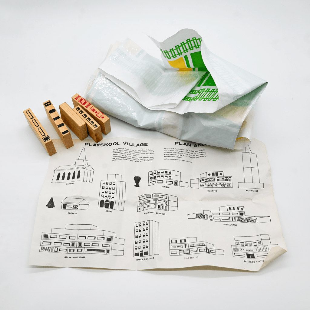 Playskool’s Village blocks have printed facades that mimic real world buildings, including designs for a church, hotel, and fire department.