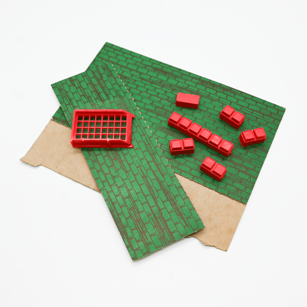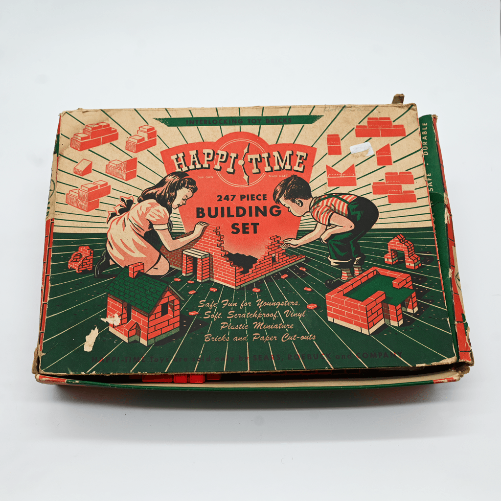 Happi Time exclusively sold their toys at Sears stores. This set features interlocking plastic bricks, with carboard materials for roof designs. Happi Time also produced rubber interlocking bricks, which most likely predates these plastic bricks.