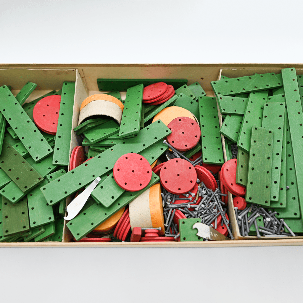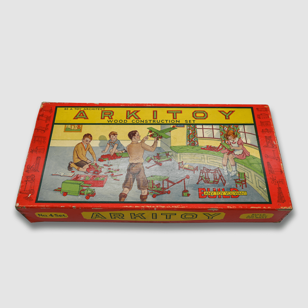 Arkitoy sets were similar to Erector sets, however wooden elements were used in place of metal. This provided a cheaper alternative than Erector toys.